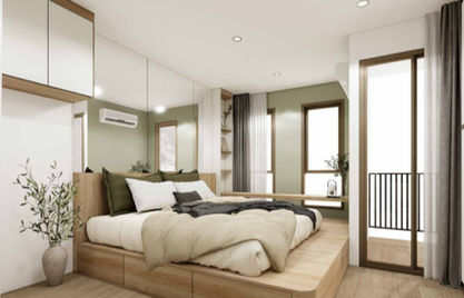 Create a warm and inviting Japandi Tatami-style interior with olive green accent walls, built-in furniture for a clutter-free look, and versatile functionality. Transform two rooms – a bedroom and a living room – with this harmonious blend of Japanese minimalism and Scandinavian functionality.